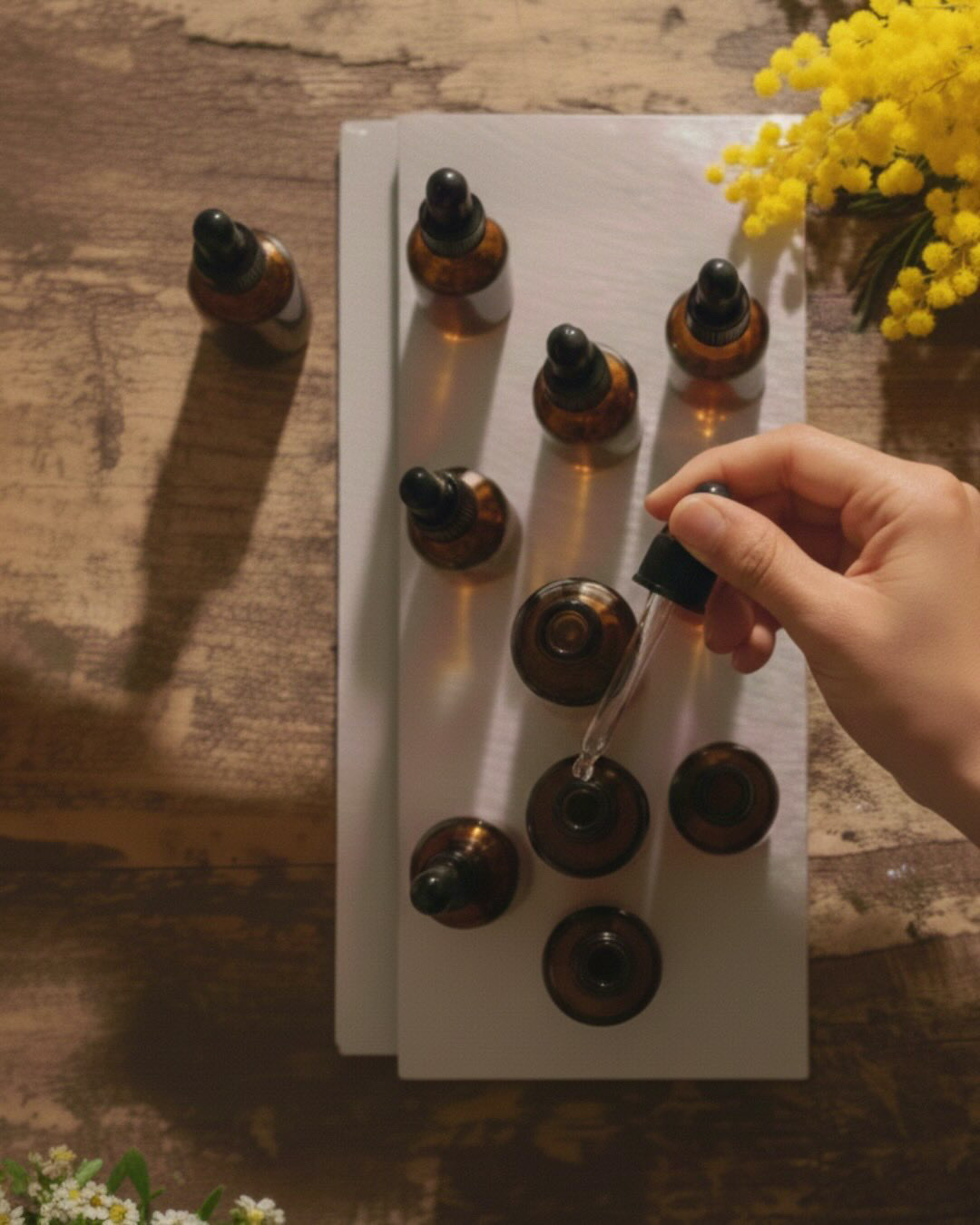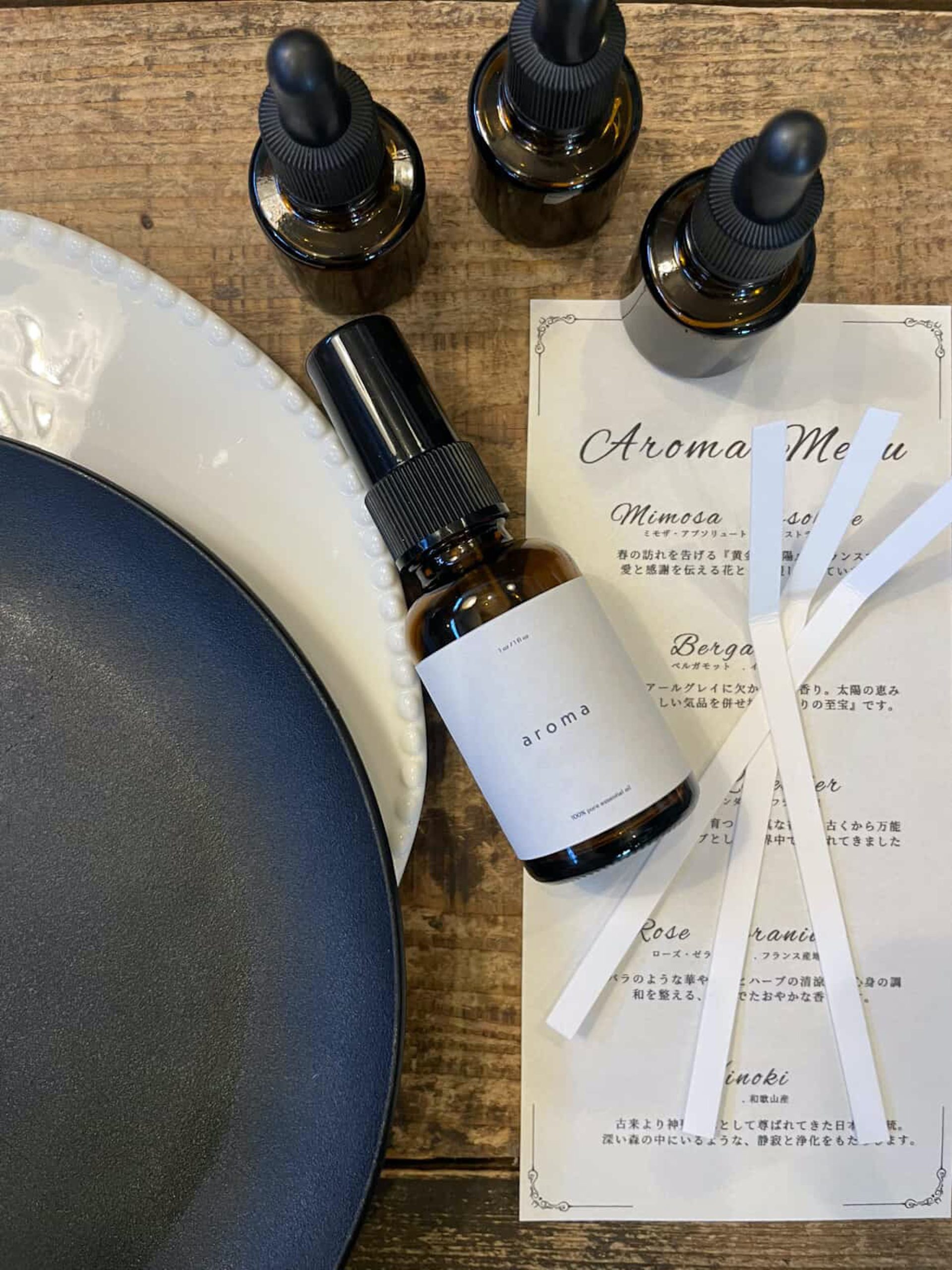 数種類の天然精油から、ミニブーケの世界観に合わせてオリジナルのブレンドを見つけます。スタッフがその場で丁寧に調香し、プロの仕上がりでお持ち帰りいただけます。