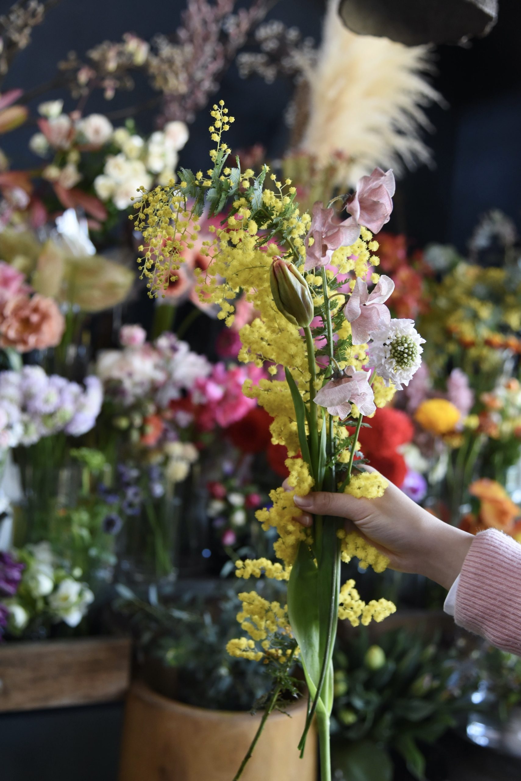 春の光を閉じ込めたような、ふわふわのミモザを主役に店内に咲き誇る花々の中から「あなたのお気に入り」を自由に選んで束ねていただけます。